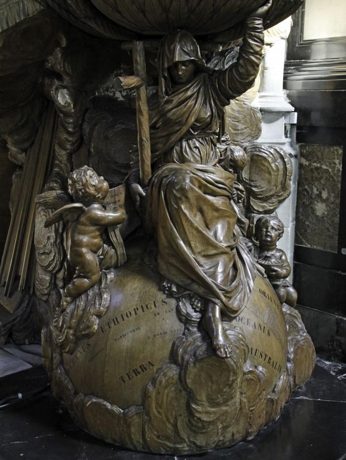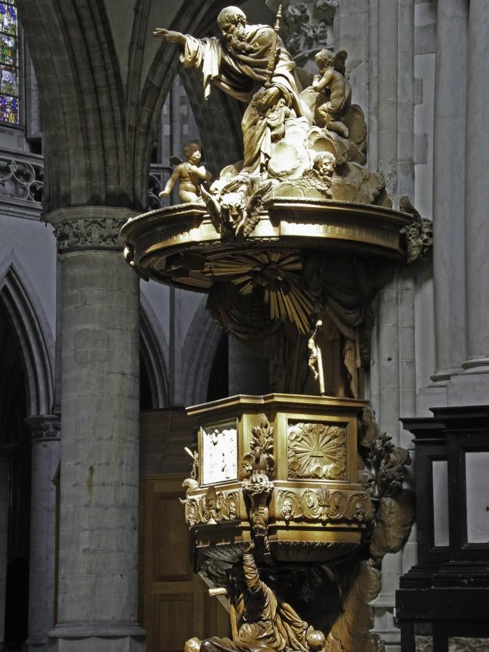 Houten gebeeldhouwde preekstoel, tussen 1806 en 1810 gebouwd door de Aalstenaar Willem van Biscom.Boven op de preekstoel het beeld van God de Vader die zijn hand uitstrekt. Onderaan is er de afbeelding van het geloof dat over de wereld heerst.