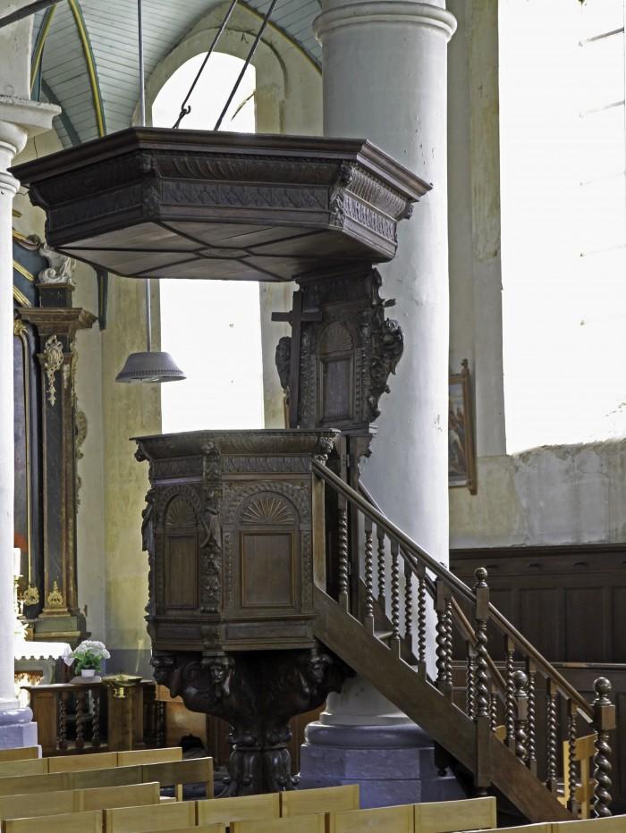 Eikenhouten preekstoel in laat-renaissance stijl uit 1654, met zeszijdige kuip en klankbord.Deel deze preekstoel