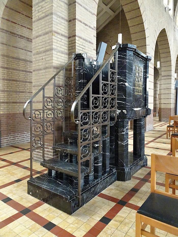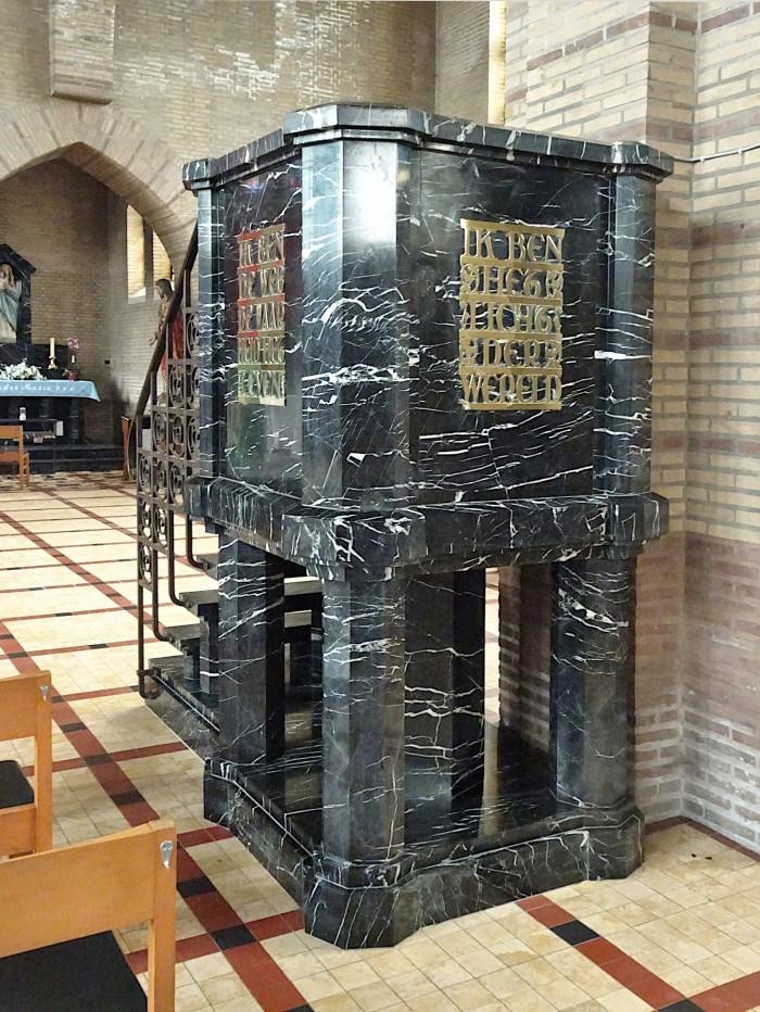 De oudste kerk op deze plaats stond hier al in de 12e eeuw, maar de huidige neogotische kerk dateert uit 1938, behalve de gotische toren, die in 1496 is gebouwd. De preekstoel van wit geaderd zwart marmer (waarschijnlijk grand antique) is eveneens uit het bouwjaar1938. In vergulde letters zijn op de kuip twee teksten van Jezus te lezen: - Ik ben het Licht der wereld - , en - Ik ben de weg, de waarheid en het leven- .Deel deze preekstoel