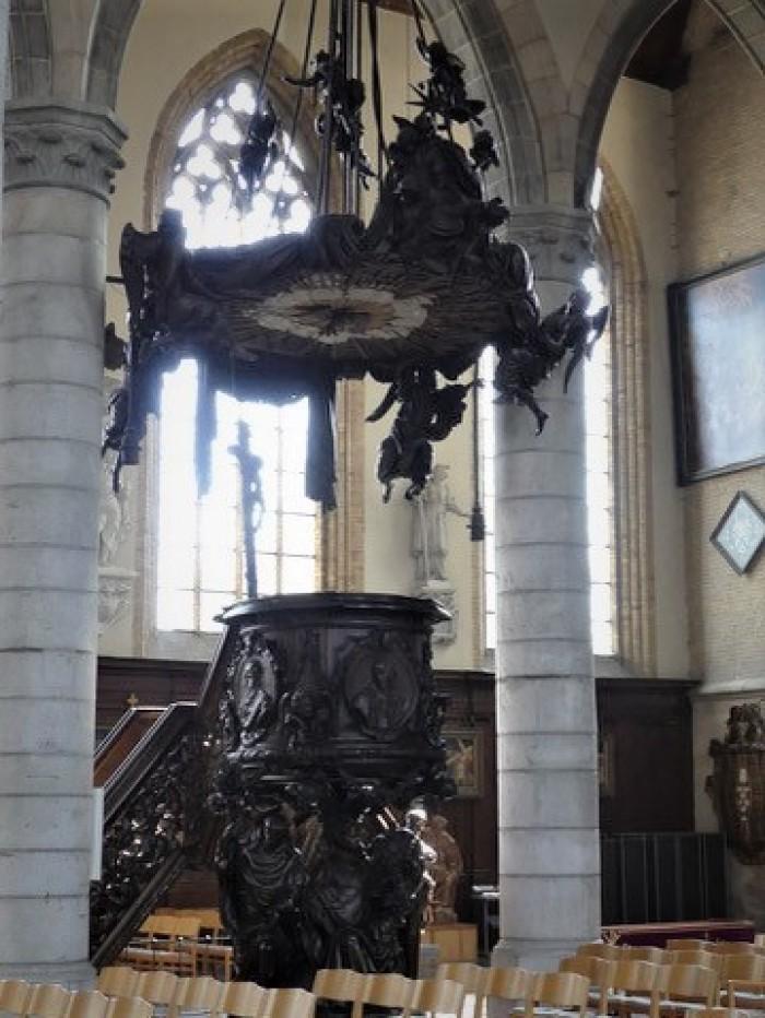 Barokke preekstoel uit 1710, afkomstig van het klooster van de dominicanen uit Brugge. In 1806 werd de preekstoel, gemaakt door een Brugs timmerman, overgebracht naar deze kerk.