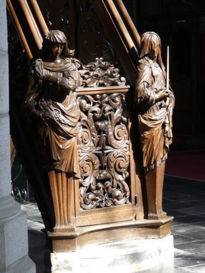 Twee heiligen vrouwen (zie 2e foto) bewaken beneden de trappen, en aan de buitenzijde van de trapleuning is een bas-reliëf met links en rechts een leeuwenkop, kleine engeltjes en de nodige paternosters aangebracht.