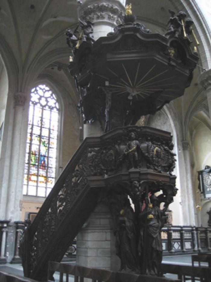Lodewijk Willemssens (1675) laat de kuip dragen door vier vrouwelijke personificaties. De deugd van het Geloof wordt als voornaamste vooropgesteld, gesteund door de zoekende Waarheid en - meer concreet - door die wetenschap die de waarheid zoekt op levensbeschouwelijk vlak: de Theologie. Trouw aan de waarheid dient het geloof doorgegeven te worden door onderricht, zoals in de predikatie. Bijna geheel verborgen onder de trap houdt de Instructio oftewel de Onderrichting een spiegel in de hand met als begeleidende tekst: "Ziet erin en gij zult wijs worden". Bij het onderricht laat men de mensen zich spiegelen aan beroemde figuren die op een bepaald vlak een uitmuntend voorbeeld zijn. De vraag hierbij is dan ook: "Aan wie weerspiegelen wij ons?".Deel deze preekstoel