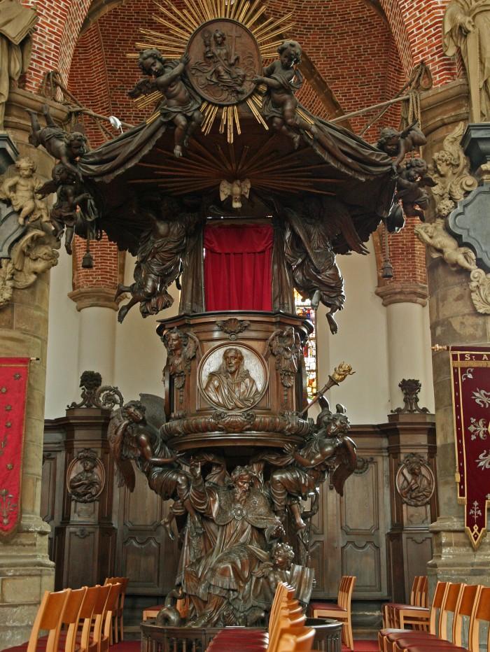 Preekstoel gebouwd ca 1715 door Willem Kerrickx. Boven de preekstoel is een prachtig versierd klankbord met daar onderaan hangend een duif. De duif is een Christelijk symbool voor verzoening, vrede en een teken van reinheid. De duif verwijst naar eenvoud, onschuld, zuiverheid en de Heilige Geest.Deel deze preekstoel