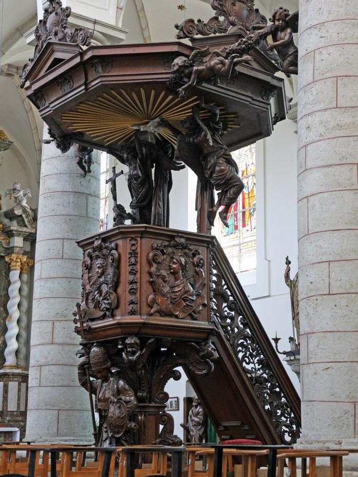 Preekstoel met prachtig houtsnijwerk uit het begin van de 18e eeuw, gemaakt door Theodoor Verhaegen.Deel deze preekstoel
