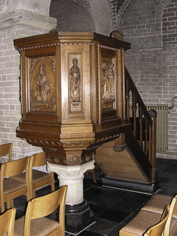 De preekstoel heeft vooraan de voorstelling van een lerende Christus met het evangelieboek in de hand. Hij is omgeven door een mandorla, een amandelvormige heiligenaureool, met daarin de Alfa en de Omega, de eerste en laatste letter van het Griekse alfabet. De letters zijn het symbool van Christus als ‘de eerste en de laatste, de oorsprong en het einde’ (Apokalyps 22, 13). In de hoeken zijn de gevleugelde symbolen van de vier evangelisten afgebeeld. Ze zijn afgeleid van het begin van hun evangelie: de mens voor Matteüs, de arend voor Johannes, de leeuw voor Marcus en de stier voor Lucas. Ze worden ook de Apokalyptische dieren genoemd, omdat ze in het visioen van het hemelse hof staan voor de troon (vgl. Apokalyps 4, 6-8).