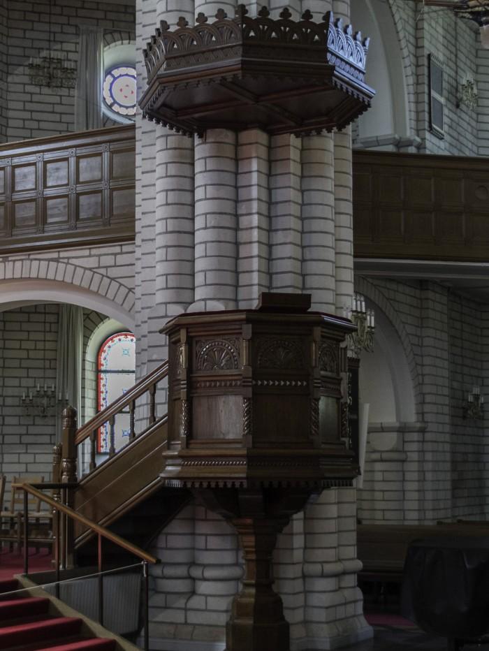 Houten preekstoel uit 1890, versierd met enig houtsnijwerk.Deel deze preekstoel