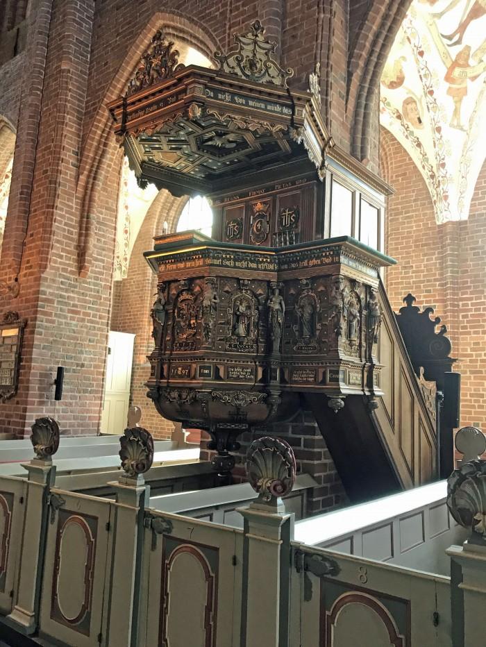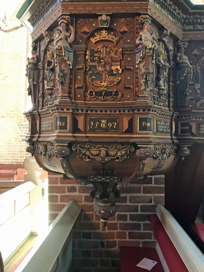 Deze kerk werd in 1430 gebouwd als kapel voor het karmelieten klooster. Na de reformatie werd het klooster school en hospitaal. In 1577 werd de kerk overgedragen aan de Duitse kooplieden.De preekstoel is in de Duitse tijd aangebracht en bevat dan ook Duitse teksten op de kuip. Op de kuip is het jaartal 1597 te zien (zie detailfoto).