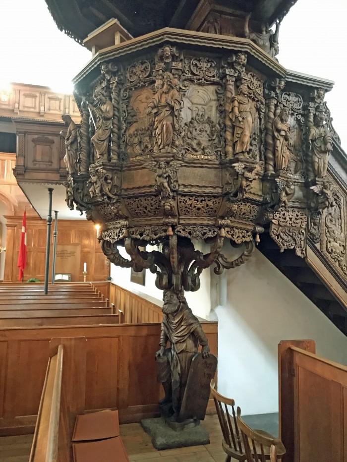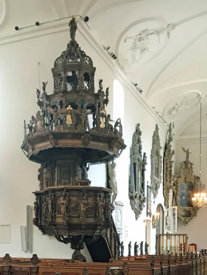 De barokke preekstoel is in 1662 door Abel Schröder vervaardigd. De reusachtige preekstoel rust op de gestalte van Mozes (zie detailfoto) en is zo hoog, omdat deze kerk drie verdiepingen bevat. Dus twee galerijen boven de kerk.Deel deze preekstoel