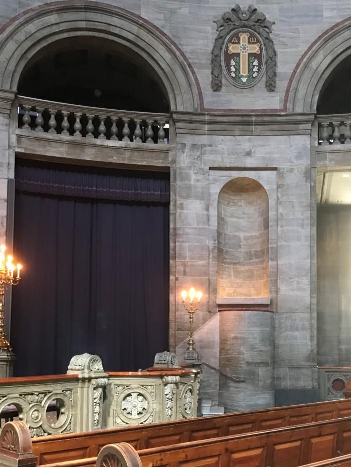 De preekstoel is in 1889 uit grijs Noors marmer vervaardigd en valt daardoor nauwelijks op, tegen de muur, die van hetzelfde materiaal is gemaakt.Deel deze preekstoel