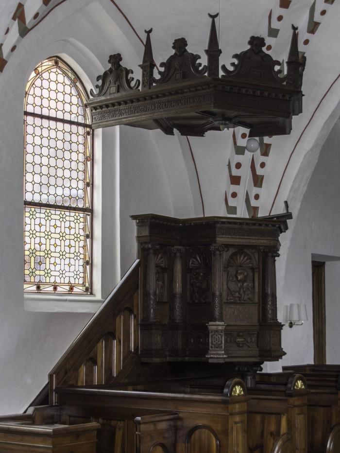 Renaissance preekstoel uit 1599, met op de zijden afbeeldingen van de 4 evangelisten.Deel deze preekstoel