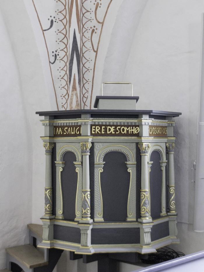 Houten preekstoel met diverse opschriften op de kuip.