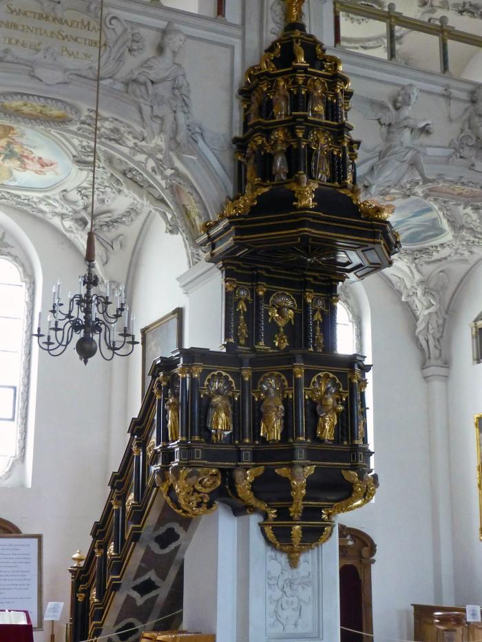 Het klooster van Benediktbeuern werd in 725 gesticht door Karel Martel, die het als relikwie een arm van Benedictus gaf. Daardoor werd dit klooster een belangrijk bedevaartsoord. Bonifatius wijdde de kloosterkerk in 739 in. In het klooster zijn veel bekende handschriften, zoals de "Carmina Burana". Ook geleerden op andere gebieden werkten hier, zoals Fraunhofer. Sinds 1930 beheren de Salesianen het klooster. De huidige laat-barokke kerk is tussen 1681 en 1686 gebouwd.De hoog opgebouwde preekstoel is nog afkomstig uit de oude kerk en bevat de 4 evangelisten, Christus en Maria op de borstwering. Boven op het klankbord staan in 2 verdiepingen de 4 kerkvaders van de westerse kerk, 4 kerkvaders van de oosterse kerk en bovenop Benedictus.