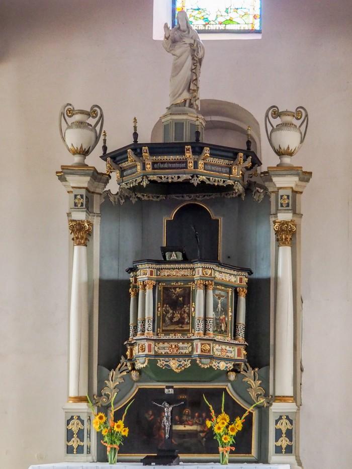 Vroeg 17e-eeuwse fraai gedecoreerde preekstoel, met een zeer bijzondere kolom-omlijsting. Deze omlijsting werd in 1766 aangebrachtDeel deze preekstoel