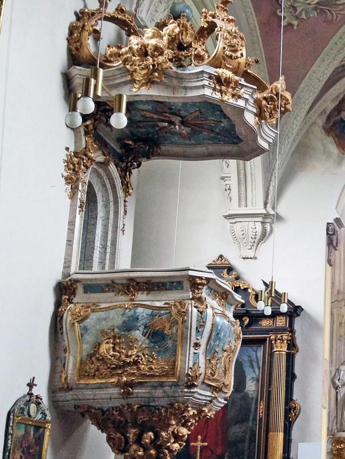 De rococo preekstoel toont aan de voorkant hoe Jezus de sleutels van de hemel aan Petrus overhandigt. Aan de zijkant (zie detail foto) hoe Jezes de golven tot bedaren brengt.