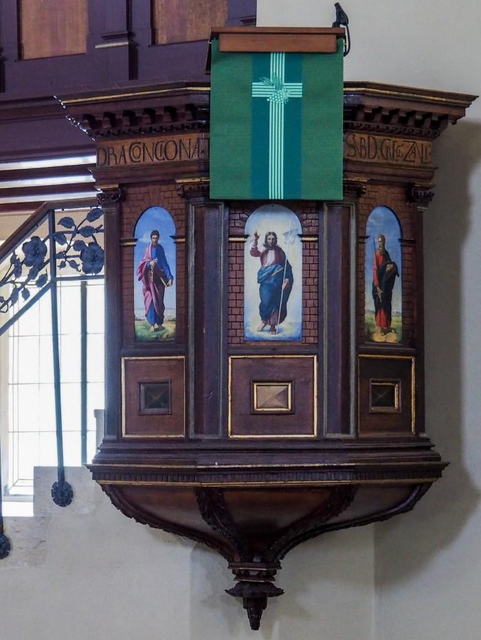 Houten preekstoel uit de 16e eeuw, met afbeeldingen en een inscriptie aan de bovenzijde. Deze herinnert aan pastor Zauling, die tot 1599 de pastoor in Frauenhain was.Deel deze preekstoel