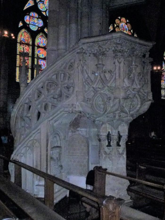 Preekstoel met rustieke laatgotische figuren uit 1560. De beeldhouwer, Jörg Kempf, is zelf te zien achter een venstertje onder de trap.Deel deze preekstoel