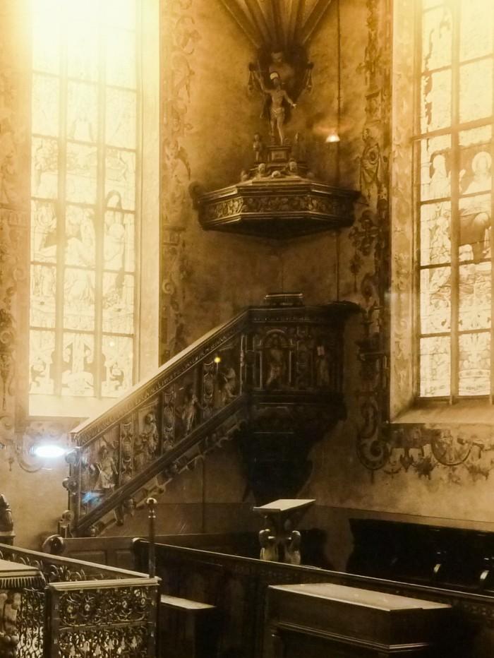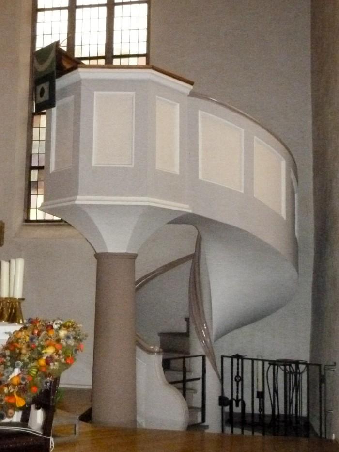 In Freudenstadt staat de Evangelische Stadtkirche, een 2-assige kerk. De assen stonden haaks op elkaar. In de inwendige hoek stond een preekstoel (2e foto) vanwaar de predikant zowel de ene as (mannen) als de andere as (vrouwen) kon bepreken. De kerk is in de laatste wereldoorlog grondig verwoest en na de oorlog weer in oude luister hersteld. Op de plaats van de oude preekstoel staat nu dus een nieuwe in de hoek (1e foto). De beuk van een as is trouwens, waarschijnlijk wegens gebrek aan belangstelling, buiten gebruik.Deel deze preekstoel