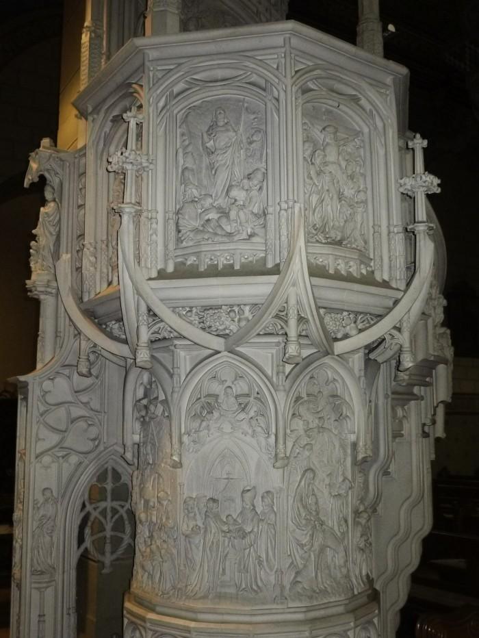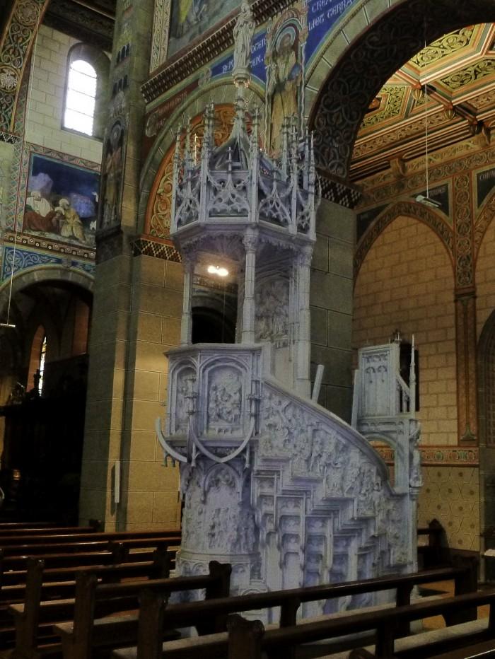 De neo-gotische preekstoel toont reliëfs met voorstellingen van de centrale gebeurtenissen van het heil in het leven van de Heer. Het klankbord bestaat uit een achthoekige kroon met een rijke en hoge toren-achtige opbouw. Op de gevel staat de gekroonde Maagd met het Kind Jezus. Op de wereldtentoonstelling in Parijs (1900) werd een duplicaat van deze preekstoel van wit terracotta gewaardeerd als een van de belangrijkste prestaties van keramische werken van deze tijd in Duitsland.Deel deze preekstoel