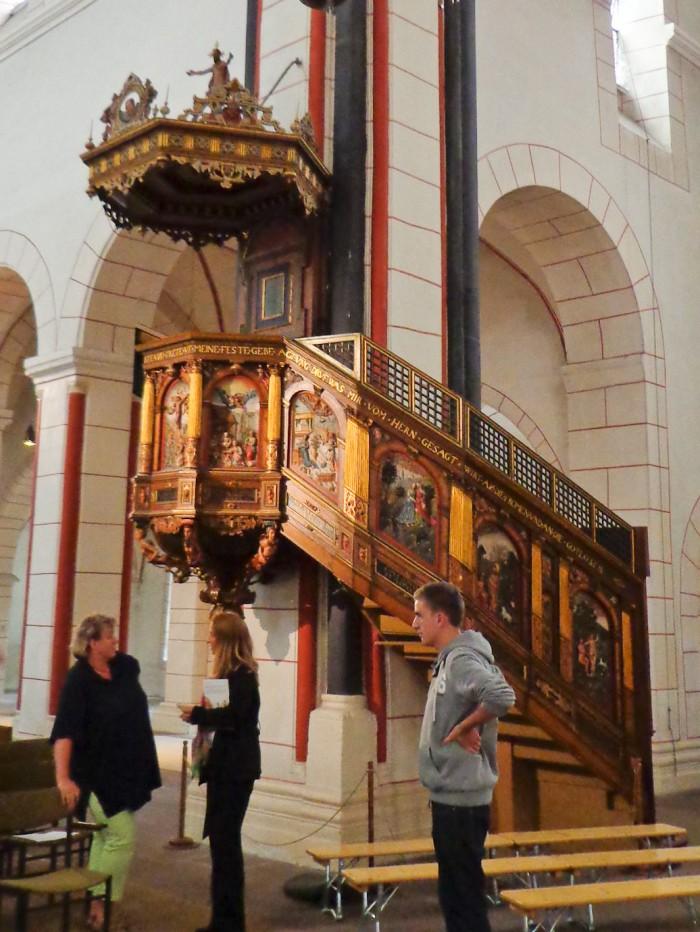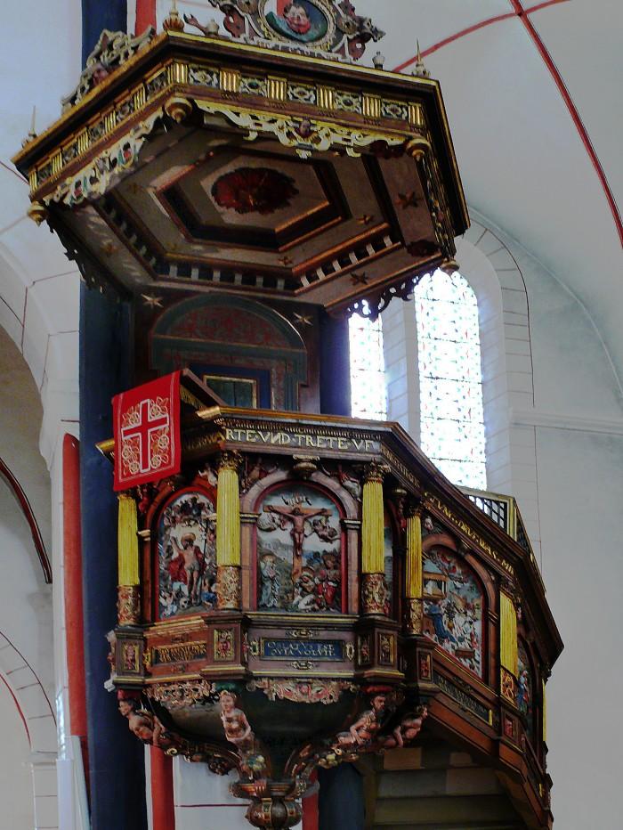 Prachtige renaissance kansel uit 1581, gemaakt door Hans Seck. Bovenop het klankbord een beeltenis van HS, vermoedelijk van de toenmalige burgemeester Hans Staes. Aan de voorzijde van de kuip zijn afbeeldingen te zien van de geboorte van Christus (rechts), de kruisiging (midden) en van de wederopstanding (links). Onderaan de kuip een afbeelding van Hermes and Caryatides.Aan de buitenkant van de trap en balustrade op de kansel worden acht Bijbelse taferelen getoond. Boven deze taferelen een Latijnse inscriptie: "HIE STEHE ICH VF MEINER WARTE VND TRETE VF MEINE FESTE GEBE ACTVNG DRVF WAS MIR VOM HERN GESAGT WIRT AN DIE FROMEN VND AN DIE GOTLOSEN".