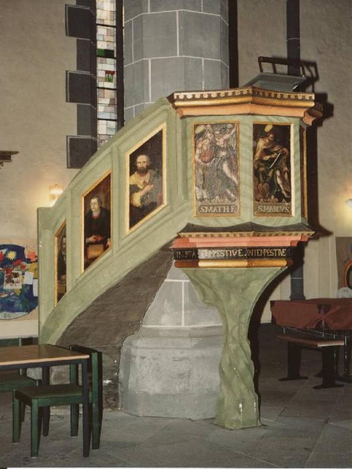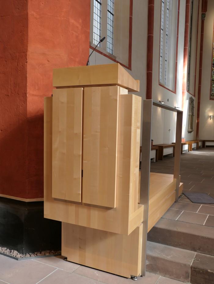 Moderne design preekstoel uit 2018, naar een ontwerp van de firma Zink.Gensichen.De detailfoto toont de vorige preekstoel uit de tijd voor de renovatie.