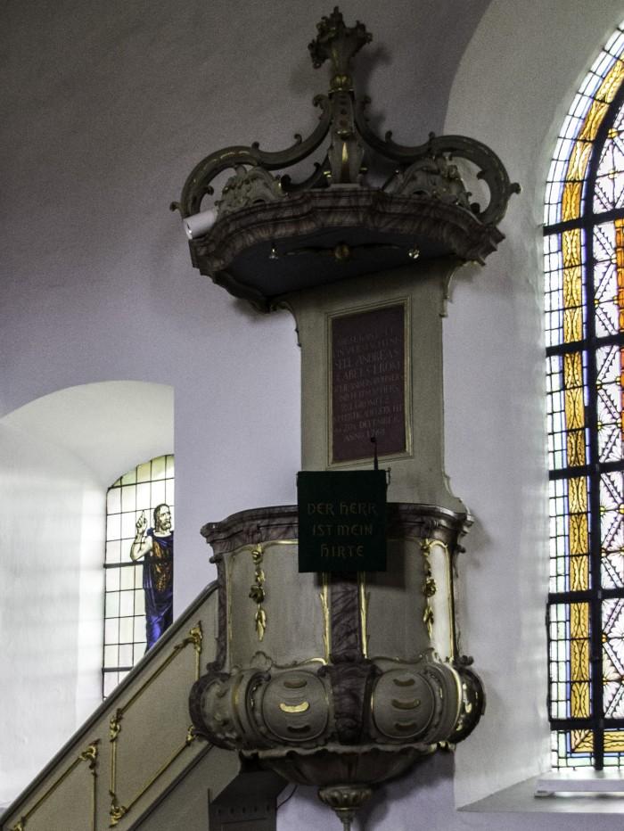 Rococo kansel uit 1762, werd gemaakt door de beeldhouwer August Friedrich Moser uit Eutin.Deel deze preekstoel