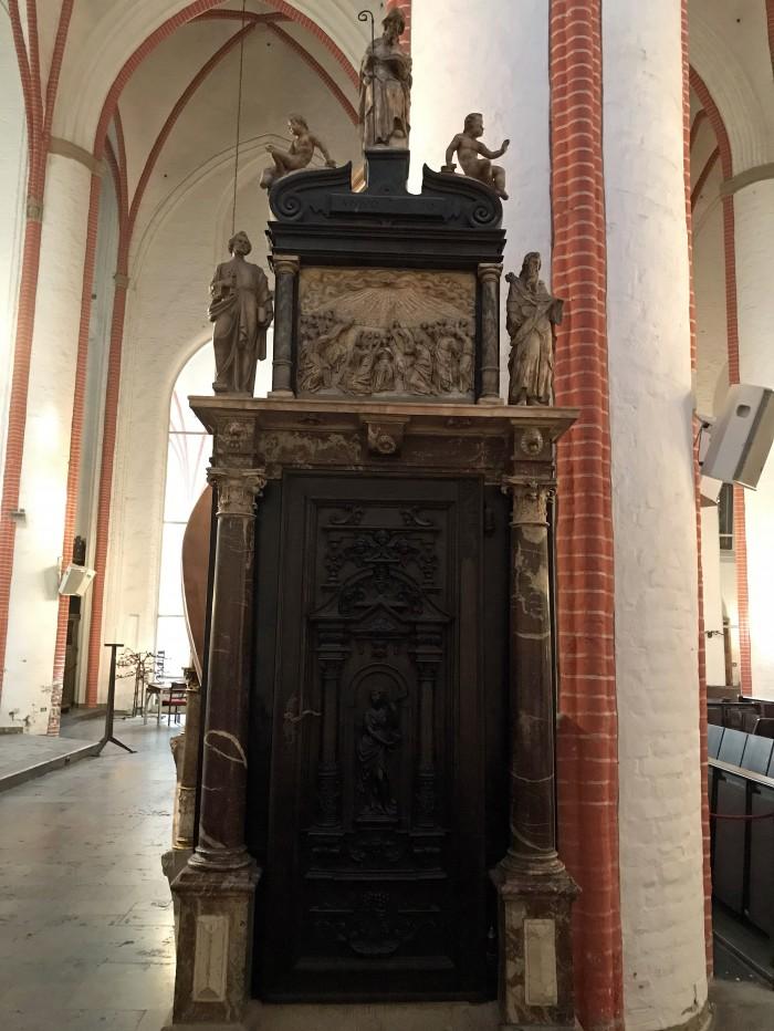 Dit is een van de 5 Lutherse hoofdkerken van Hamburg. De huidige kerk stamt uit de 14e eeuw en kende in de loop der tijden diverse uitbreidingen.De preekstoel is in 1610 gemaakt in de werkplaats van Georg Baumann uit diverse soorten en kleuren marmer, waarbij tussen de omlijstingen afbeeldingen van albast zijn aangebracht.