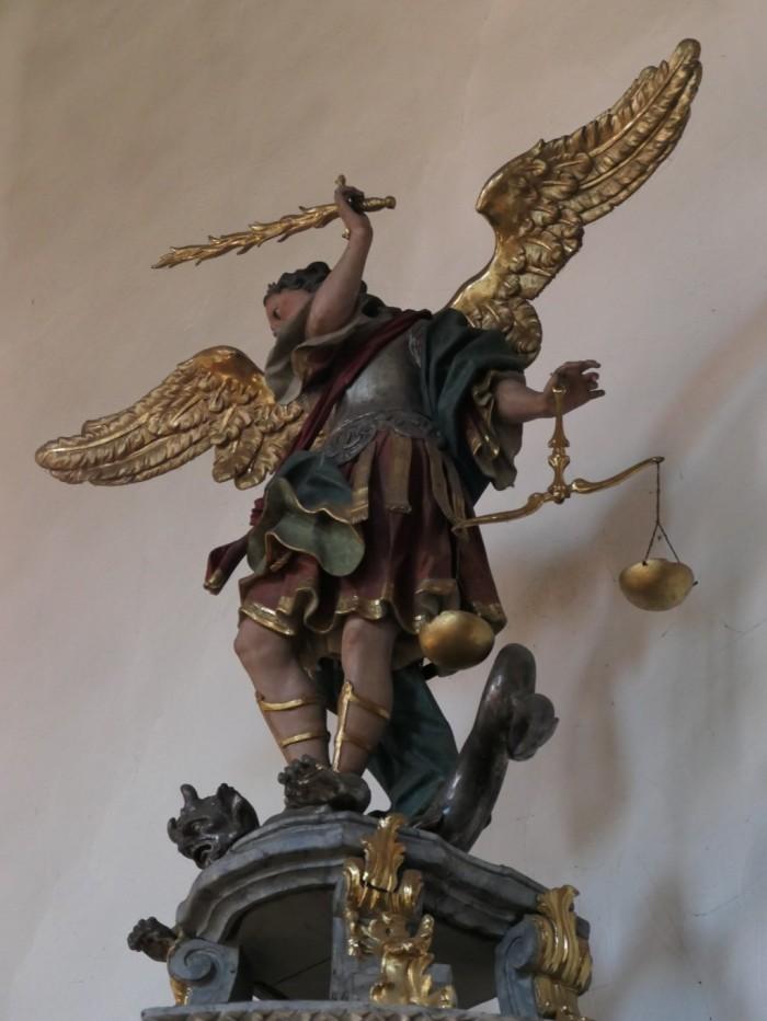 Sinds 1963 is de uit hout gesneden figuur van St. Michael, dat oorspronkelijk bij het voormalige hoogaltaar uit 1672 hoorde, bovenop het klankbord geplaatst. De aartsengel staat op de demon die hij heeft neergeslagen met het zwaard in zijn rechterhand. De weegschaal in zijn linkerhand identificeert hem als zielengids.