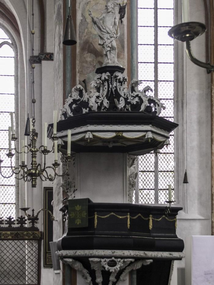 Preekstoel uit 1698, gemaakt door de beeldhouwer Jacob Budde.Deel deze preekstoel