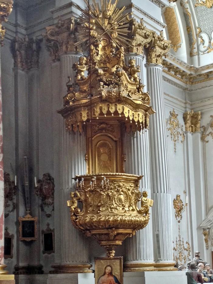 Deze kerk, horend bij het dames-klooster St Anna, werd in 1735 ingewijd naar een ontwerp van Johann Baptist Gunezrainer.Deze preekstoel is vrijwel tegelijkertijd vervaardigd als die in de Asamkirche er vlakbij. Waar deze preekstoel nog enigszins strak van vorm is, barok, gaan de vormen in de rococo helemaal "los".