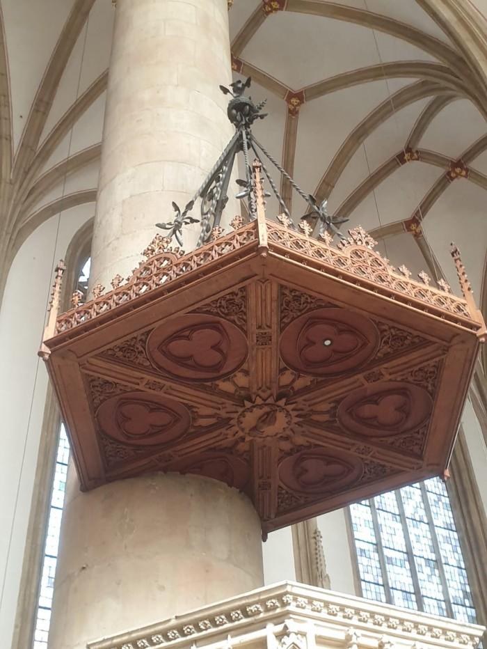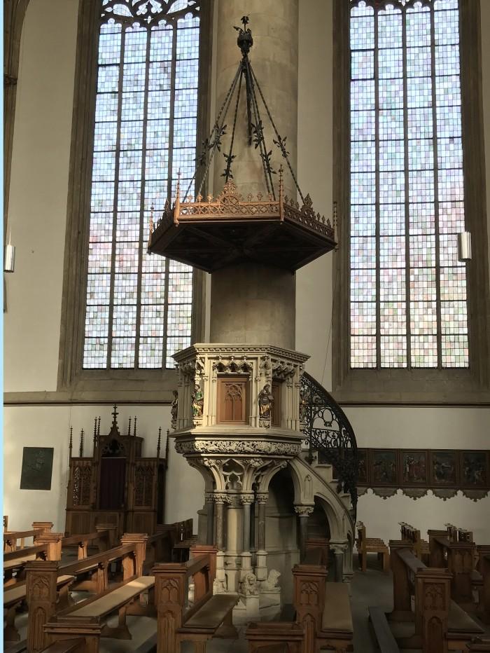 Deze gotische kerk werk tussen 1375 en 1440 gebouwd. Aan de toren ervan hangen nog steeds de ijzeren kooien, waarin van 1536 tot 1585 de lijken hingen van o.a. Jan van Leiden, de koning van het Koninkrijk van Sion van 1534-1535. De preekstoel is gemaakt van het Baumberger zandsteen, waarmee ook het hele gotische interieur in de 14e en 15e eeuw is gemaakt.Het houten klankbord is ook aan de onderzijde voorzien van fraai houtsnijwerk (zie detailfoto van Geja Zwiers).