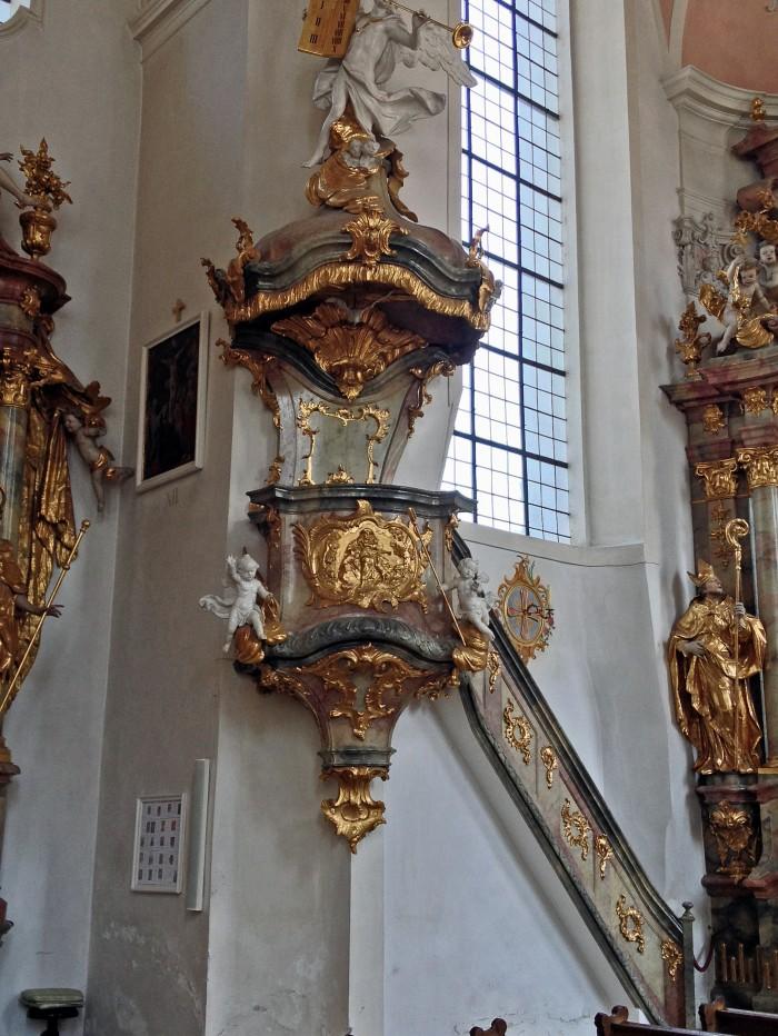 De kerk werd door Joseph Schmuzer uit Wessobrunn ontworpen en in 1749 ingewijd. Samen met zijn zoon Franz Xaver Schmuzer verzorgde hij ook de barokke versieringen. In deze kerk staat ook het kruis, waarvoor de bewoners van Oberammergau in 1633 beloofden om elke 10 jaar passiespelen te houden.De barokke preekstoel uit 1749 is door Franz Xaver Schmuzer uit Wessobrunn vervaardigd.
