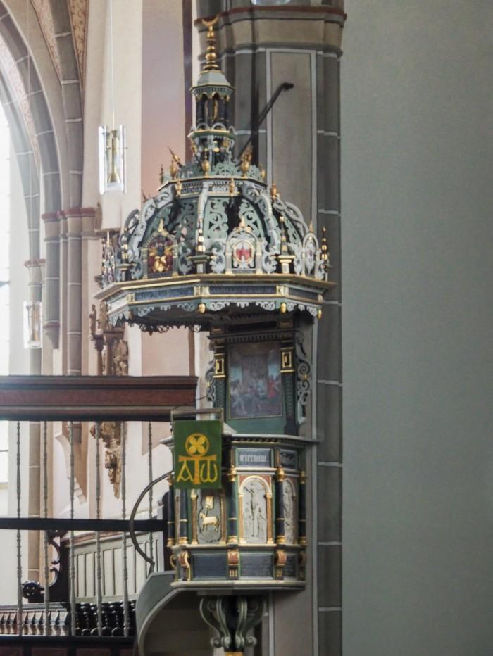 Preekstoel uit 1603 met rijk gedecoreerd klankbord uit 1660. De zijkant van de achtzijdige preekstoelkuip zijn versierd met reliëfs; Opschrift oa: "Verbum Domini manet in aeternum Ano 1603" (Het woord des Heren blijft voor altijd, in het jaar 1603). De preekstoel staat sinds 1914 op de zuidoostpijler, voorheen op de middenpijler van het schip.Deel deze preekstoel
