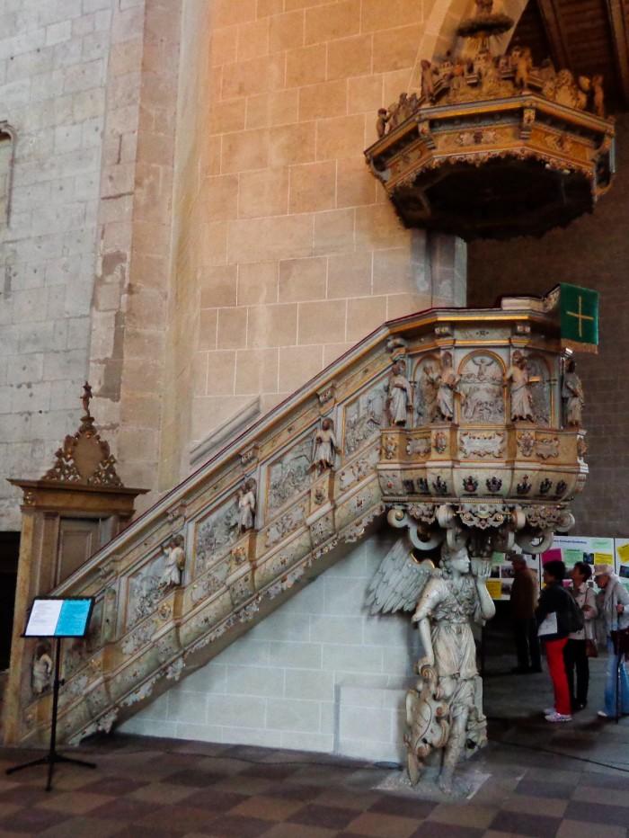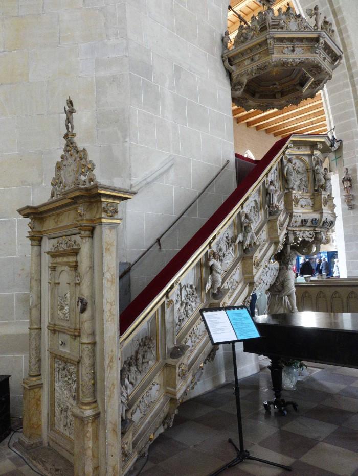 Mooie renaissance preekstoel van George Steyger uit 1595. Deze houten preekstoel is een marmer imitatie met de aartsengel Gabriël als drager. Het klankbord toont het hemelse Jeruzalem en God de Vader op een wolk. Aan de zijkant afbeeldingen van de apostelen, de Tuin van Eden, Adam en Eva, de schepping, de geboorte van Christus, de kruisiging, begrafenis, Jezus nedergedaald in het rijk van de dood, de opstanding, de hemelvaart.