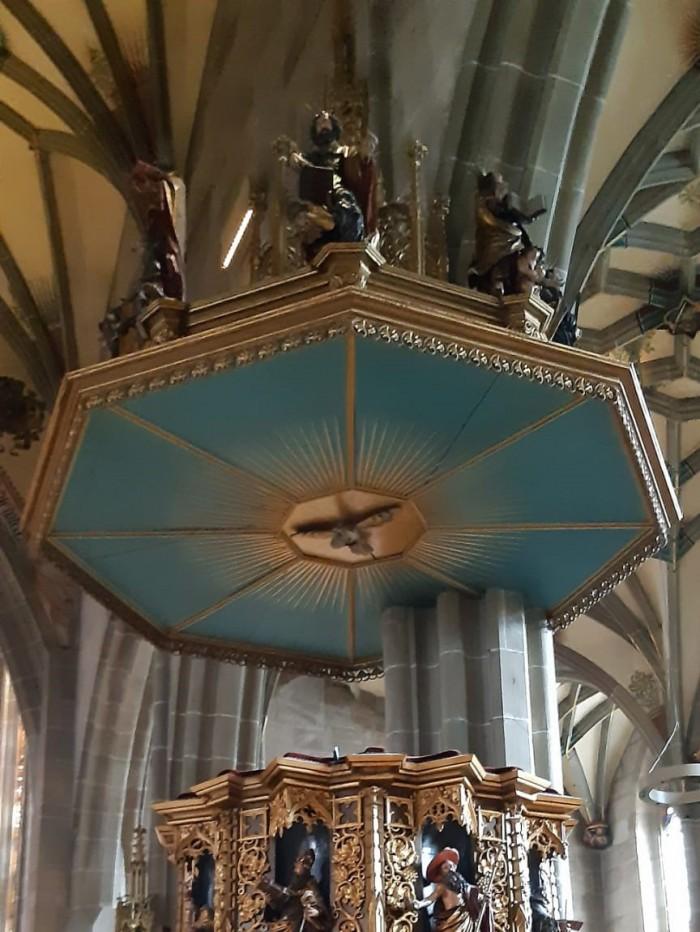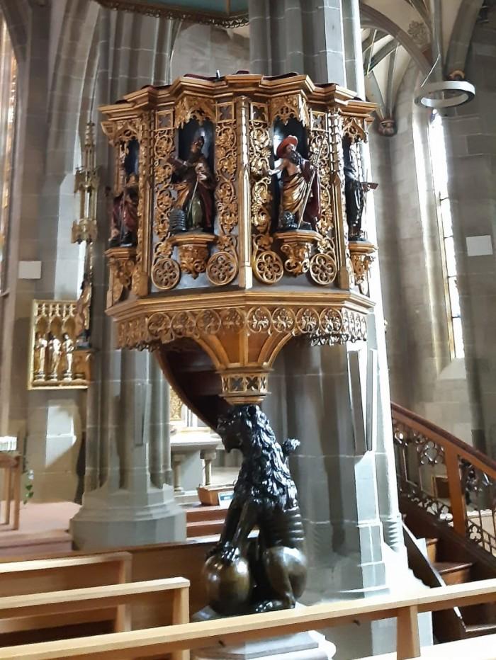De preekstoel is een werk uit de vroege 17e eeuw in typisch Zuid-Duitse, post-gotische stijl.Een bronzen leeuw draagt de kansel. Boven de preekstoel een klankbord (zie detailfoto)