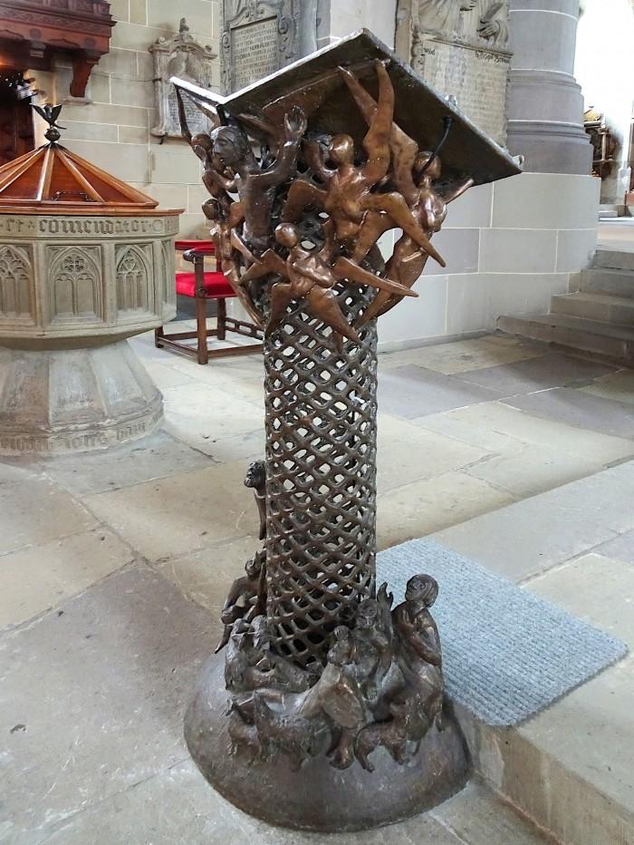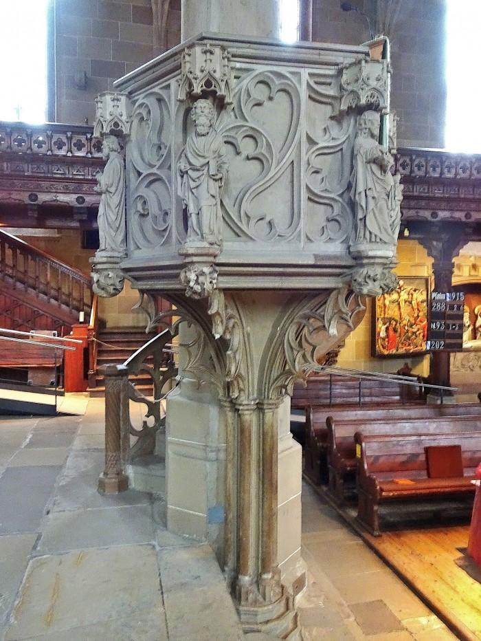 Gotische preekstoel, 15e eeuws - geen verdere gegevens bekend. In tegenstelling tot een oude foto uit Wikipedia heeft de preekstoel in 2021 géén klankbord meer.Het spreekgestoelte/de Ambo, is gemaakt door Ulrich Henn, een kunstenaar uit Schwäbisch Hall. Het verbeeldt een scène uit het kerstverhaal. Het leesvlak wordt vastgehouden door de engel uit Openbaringen en zijn gastheren. Aan de voet van de Ambo ontvangen de herders het goede nieuws. Van hieruit wordt elke zondag het Woord van God verkondigd.