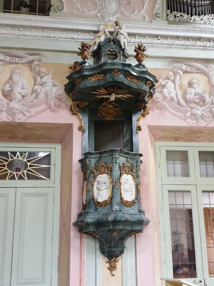 Barokken preekstoel uit 1737, ontworpen door J.C. Schlaun.Deel deze preekstoel