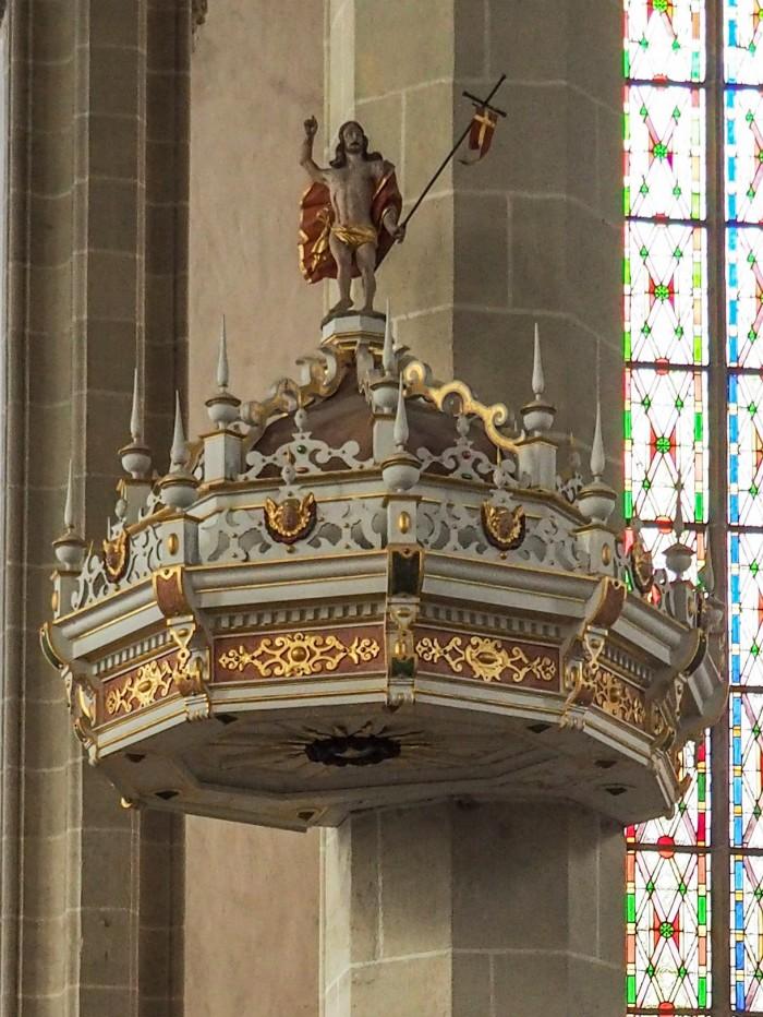Deze rijk versierde laat-renaissancistische preekstoel uit 1582 komt van de werkplaats van Georg Wittenberger uit Torgau. Opmerkelijk is de oude driedelige zandloper, die voor de vroegere predikers als tijdsaanduiding diende.Deel deze preekstoel