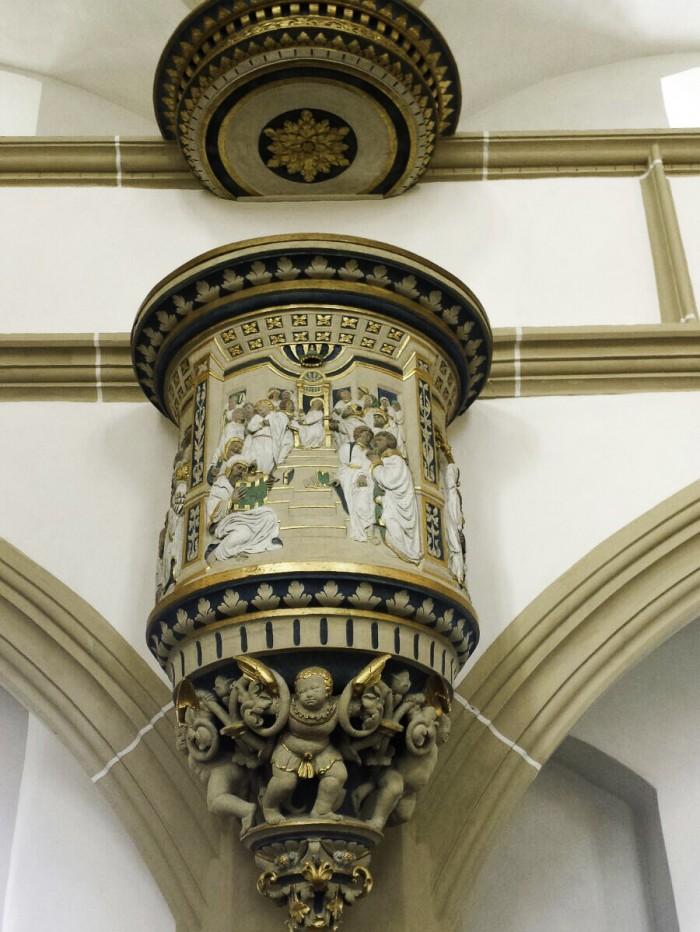 De preekstoel hangt boven het portaal en verwelkomt bezoekers van de kerk. De kuip uit de 16e eeuw is een werk van de beeldhouwer Simon Schröter. De reliëfs tonen scènes uit het leven van Jezus: de verdrijving van de geldwisselaars uit de tempel, Jezus en de overspelige vrouw en de twaalfjarige Jezus in de tempel. De schetsen voor de motieven op de preekstoel zijn gemaakt door Lucas Cranach.