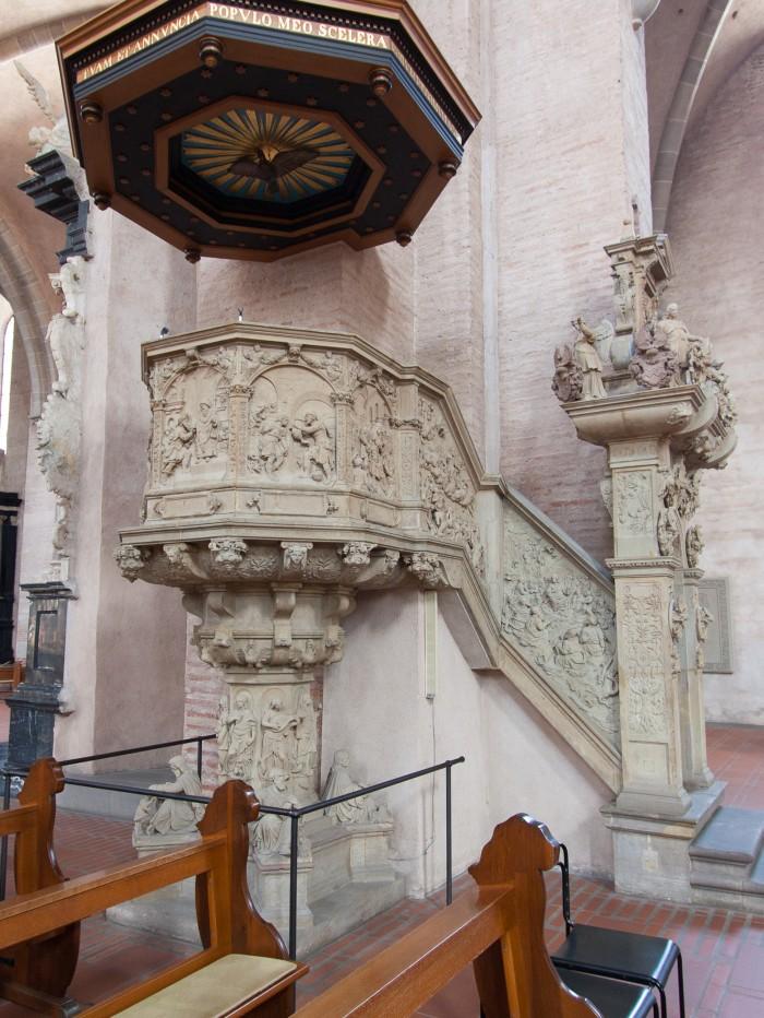 Deze preekstoel uit 1570-1572, met een indrukwekkende toegangspoort, is vervaardigd van licht zandsteen door de beeldhouwer Hans Rupprecht Hoffmann.De jezuïeten stelden bij de bouw de voorwaarde dat de nieuwe preekstoel in overeenstemming moest zijn met de ideeën van de toekomstige predikant. Alles moest erop wijzen dat geloof en actie samen gaan. Dit werd duidelijk gemaakt door lichamelijke werken van barmhartigheid op de kuip van de preekstoel af te beelden.