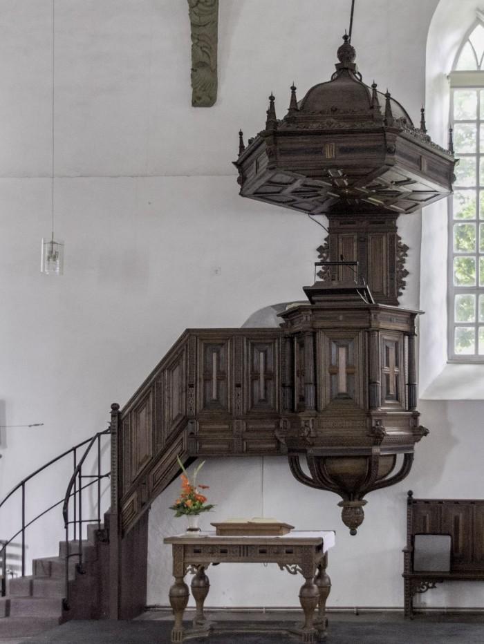 Deze preekstoel is uit het jaar 1649, gemaakt in de stijl van de late Renaissance is rijkelijk versierd met beslagwerk, Ionische hoekkolommen met leeuwenkoppen en geprofileerde kussenvullingen. De preekstoel is voorzien van een zeshoekige geluidsoverkapping.Deel deze preekstoel