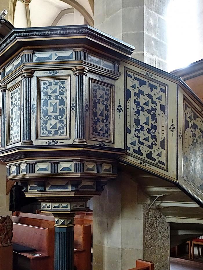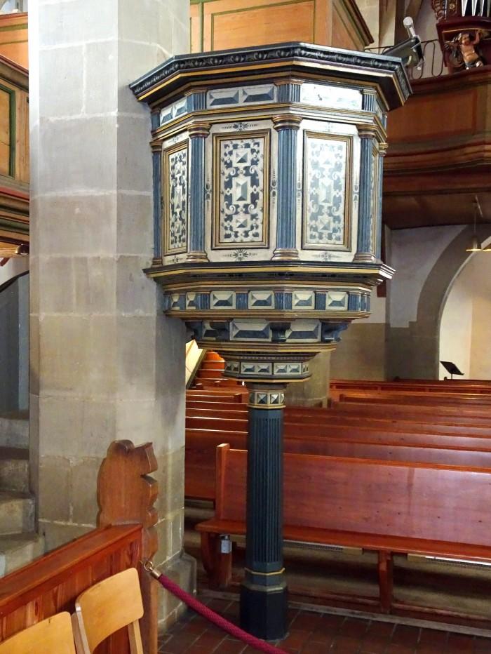 De driebeukige hallenkerk werd gebouwd tussen 1419 en 1425. In 1590 werd de kerk aangepast aan de wensen van de Reformatie. Zo werd een renaissancepreekstoel met Toscaanse kolomstructuur geplaatst. Het doopvont werd pas in 1966 van Lichtel bij Creglingen naar Weikersheim overgebracht. Het dateert uit de laatromaanse periode (14e eeuw). De kerk is van de Evangelische gemeente.Deel deze preekstoel
