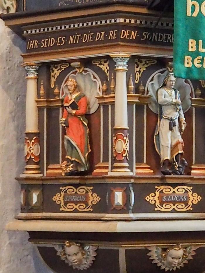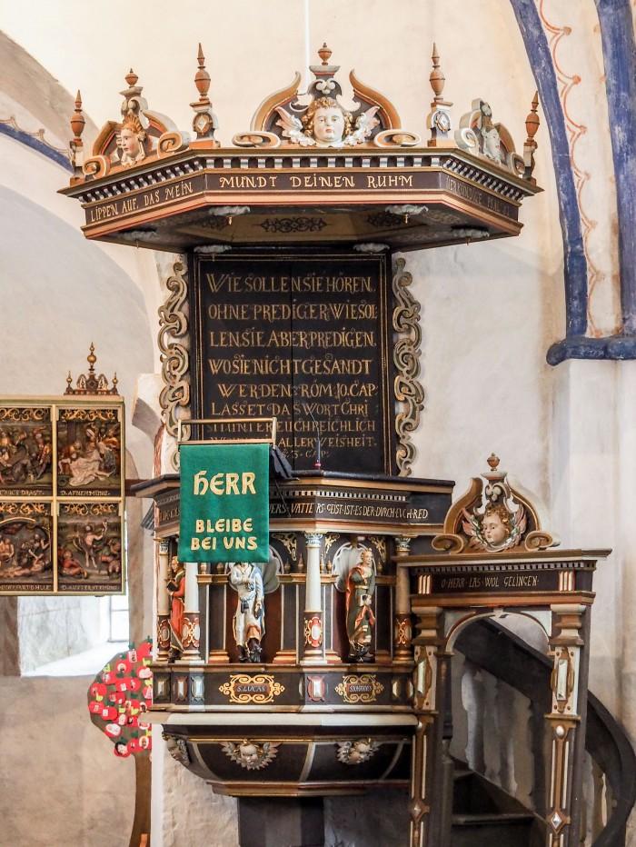Volgens kerkverslagen is de preekstoel in 1644 gemaakt door meestervakman Gert Borkemann uit Oldenburg. De figuren van de vier evangelisten met hun attributen man - leeuw - stier - adelaar staan ​​in ondiepe gewelfde nissen. De binnenkant van het klankbord heeft gebeeldhouwde bloemvormen op de hoeken, arabesken en een ster in het midden. Engelenkoppen vormen de structuur, net als die aan de buitenkant van de preekstoel. De tekst op de zijbalk luidt: "Heer, open mijn lippen dat mijn mond uw glorie zal verklaren" (Psalm 51:17). Boven de trap bekroond door een engelenkop staat het gebed van de predikant: "Heer, zorg er alstublieft voor dat het goed met ons gaat!" (Psalm 118:25).Deel deze preekstoel