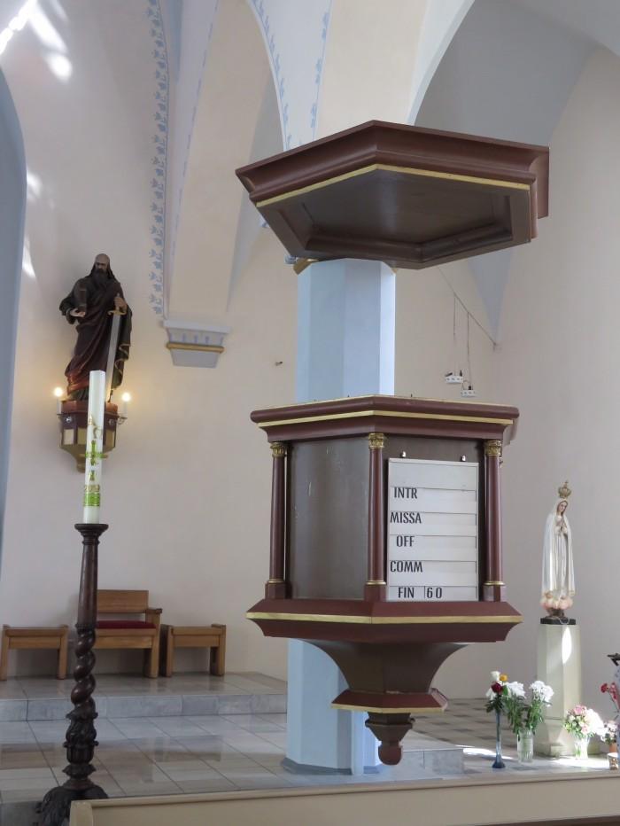 Over deze preekstoel is geen informatie gevonden.Wel weten we dat er in 2002-2003 een renovatie van de kerk heeft plaatsgevonden.