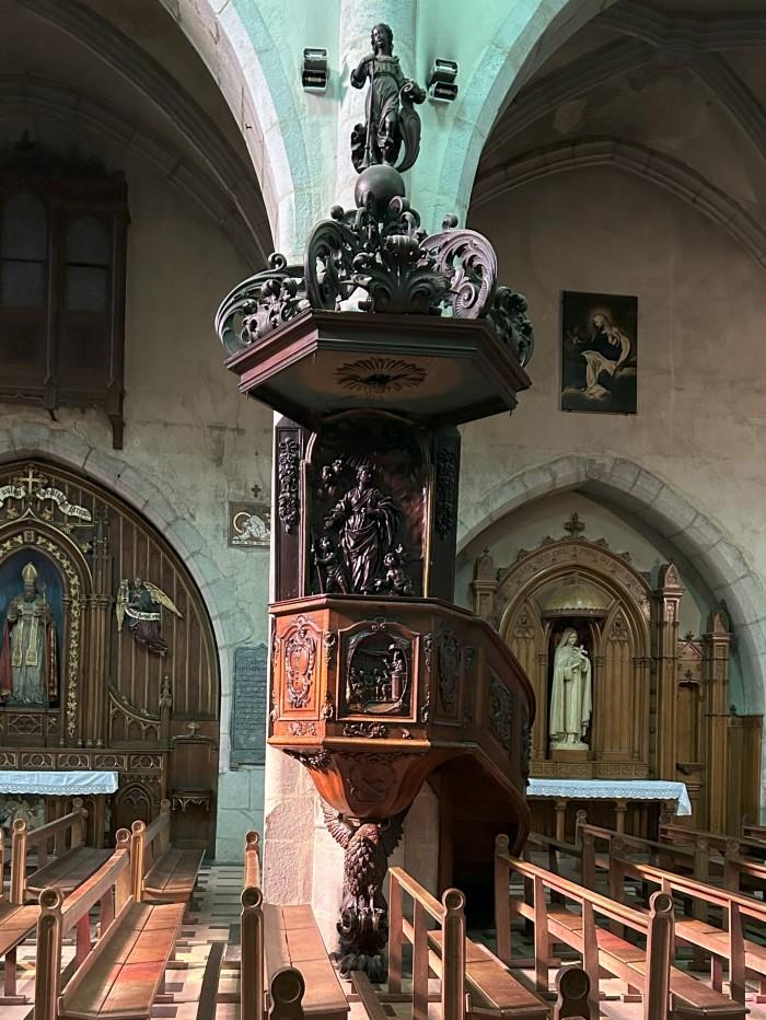 Deze kerk was bedoeld als kapel voor de Franciscanen, maar na de komst van de Reformatie week de bisschop van Geneve uit naar Annecy en koos deze kerk als zijn kathedraal.Deel deze preekstoel