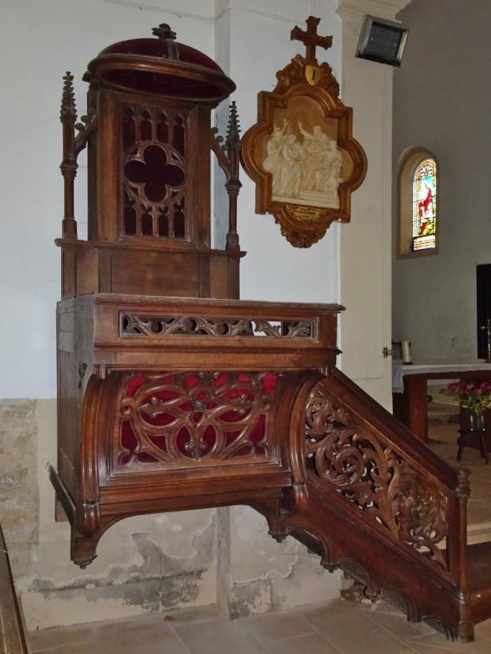 De kerk van Saint-Michel-Archangel is gebouwd aan de voet van het kasteel van Castelnaud-la-Chapelle in het Dordognegebied. De kerk is gewijd aan St. Michael, die de engel Lucifer verdreef en tegen de Draak van de Apocalyps vocht. Rond de 17e eeuw werd een romaanse kerk gebouwd., die in de 19e eeuw is gerestaureerd. In juni 1944 verwoestte een geallieerd bombardement een groot deel van het dak. In 1948 was de schade hersteld. Of de preekstoel van na 1948 is, of nog delen heeft uit een vroegere restauratie, is niet bekend.Deel deze preekstoel