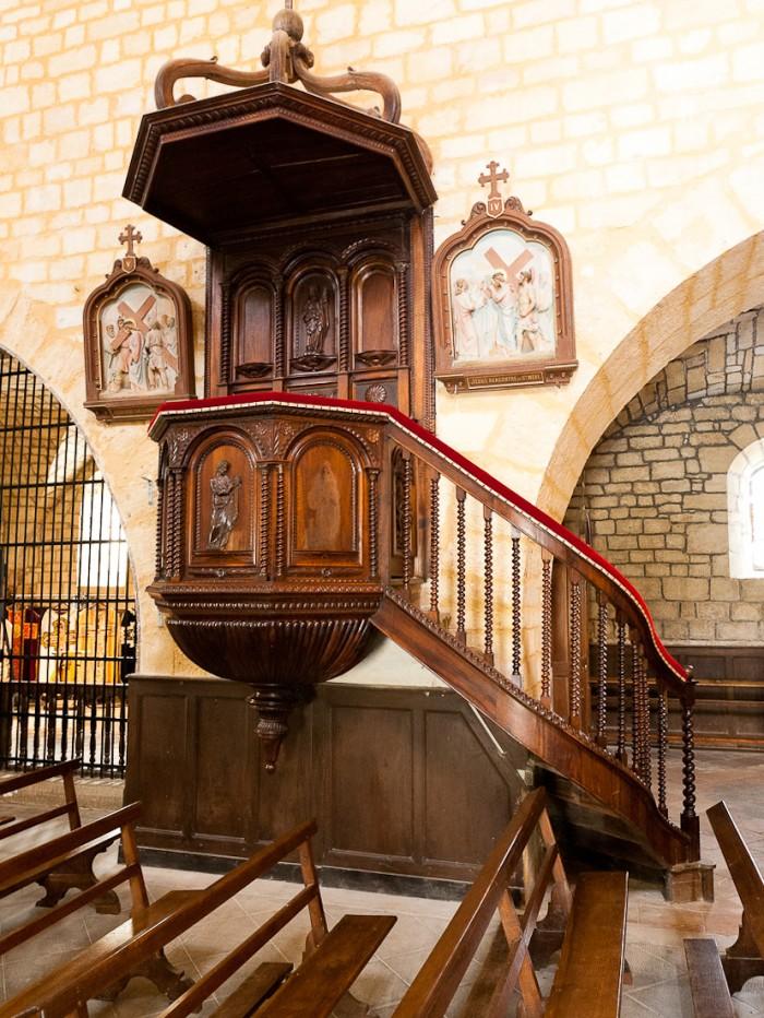 Preekstoel, vermoedelijk uit 1622. Aan de voorkant van de preekstoel Maria met het kind Jezus. Naast de preekstoel zijn twee taferelen van de kruisweg te zien.Deel deze preekstoel