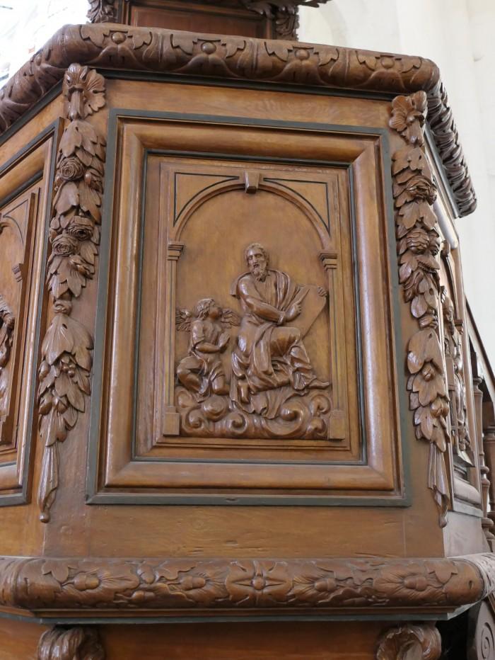 De preekstoel is uit de 18e eeuw, de panelen op de kuip vertegenwoordigen de vier evangelisten enhun symbool: de engel voor Matheus, de leeuw voor Marcus, de stier voor Lukas en de adelaar voor Johannes. Op het klankbord blaast een engel een trompet.