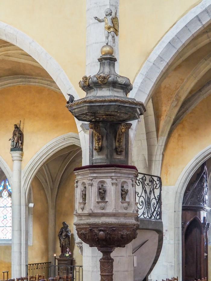Preekstoel uit 1612 oorspronkelijk gemaakt door Martin Chaumont. De trap werd door J.F. Georgeon in 1766 vervangen. De beeldjes aan de zijkant van de kuip dateren uit de 18e eeuw. Bovenop het klankbord een engel, vervaardigd in de 18e eeuw.Deel deze preekstoel