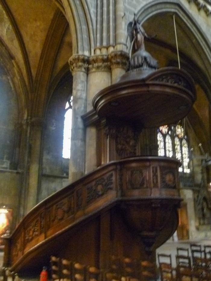 Over deze preekstoel is niets bekend. Op de panelen zien we classicistische versieringen zoals slingers. Tegenover de preekstoel aan de overzijde van de kerk treffen we een rijk versierd balkon aan (zie 2e foto). Mogelijk deed deze ook dienst als preekstoel, of was deze bestemd voor hoogwaardigheidsbekleders.
