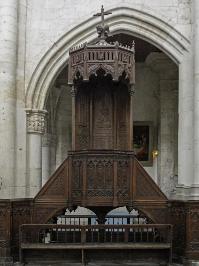 Prachtig gesneden houten preekstoel uit 1840, gemaakt door Jeanson. Op de achtervlak, boven de kuip, een afbeelding van Johannes de Doper. Voorop de kuip afbeeldingen van de apostelen en de theologische deugden (hier, geloof en hoop).Deel deze preekstoel